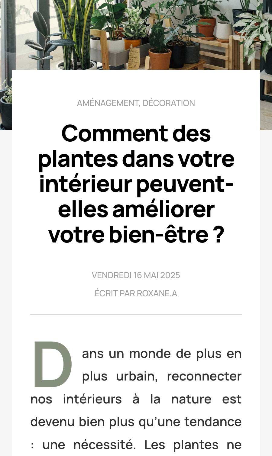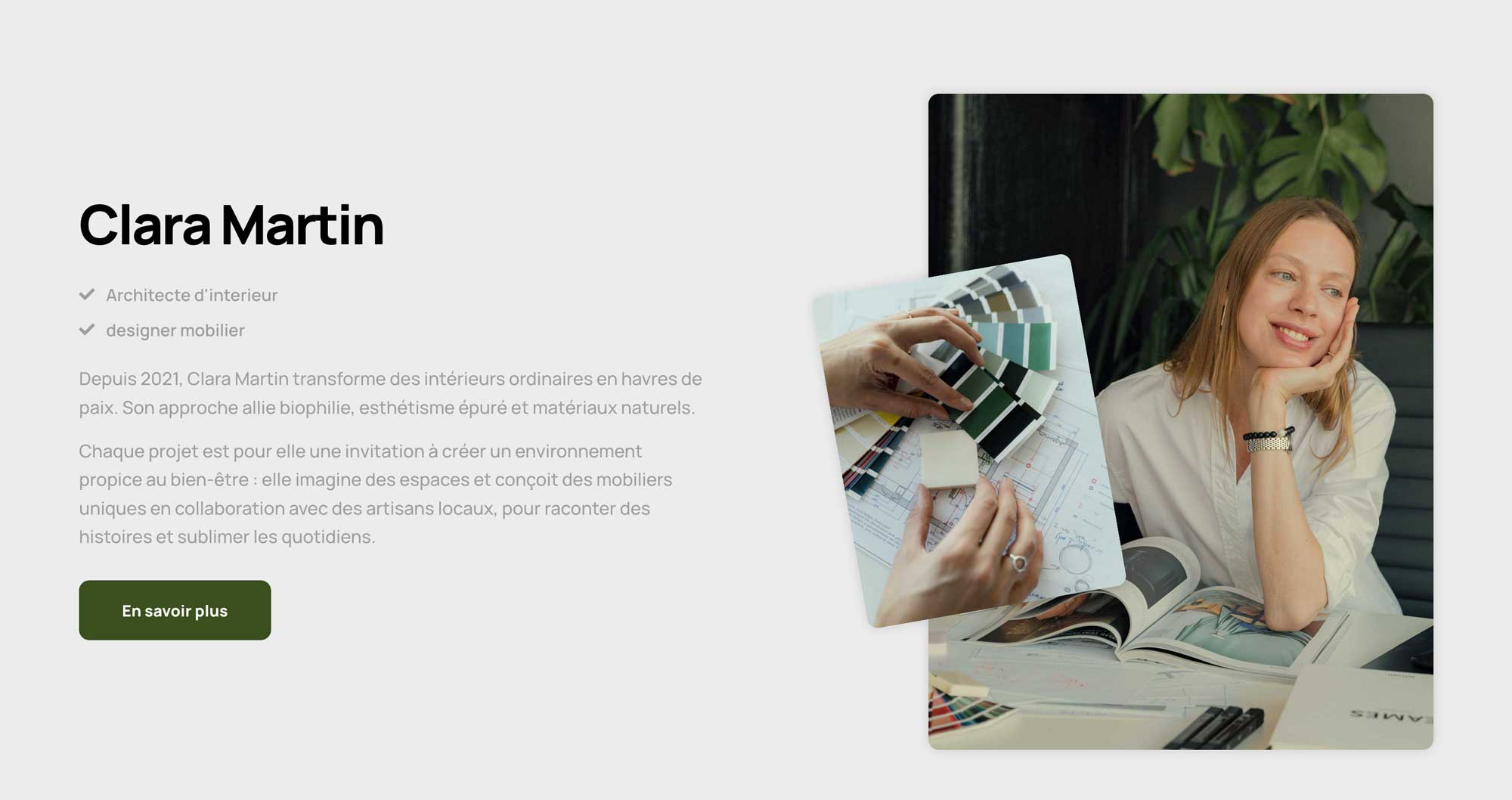 Clara souhaitait un site qui lui permette de présenter son univers visuel en gagnant d’avantage de visibilité auprès d’une clientèle plus large. Elle souhaitait aussi y intégrer un formulaire pour pouvoir être contactée via internet. Je lui ai réalisé un site web qui lui permette d’une part de présenter ses projets passés afin d’inspirer confiance à ses futurs clients, ainsi qu’une section articles qu’elle pourra poster pour partager des conseils sur sa vision de l’espace ce qui l’aidera aussi pour le référencement de son site.